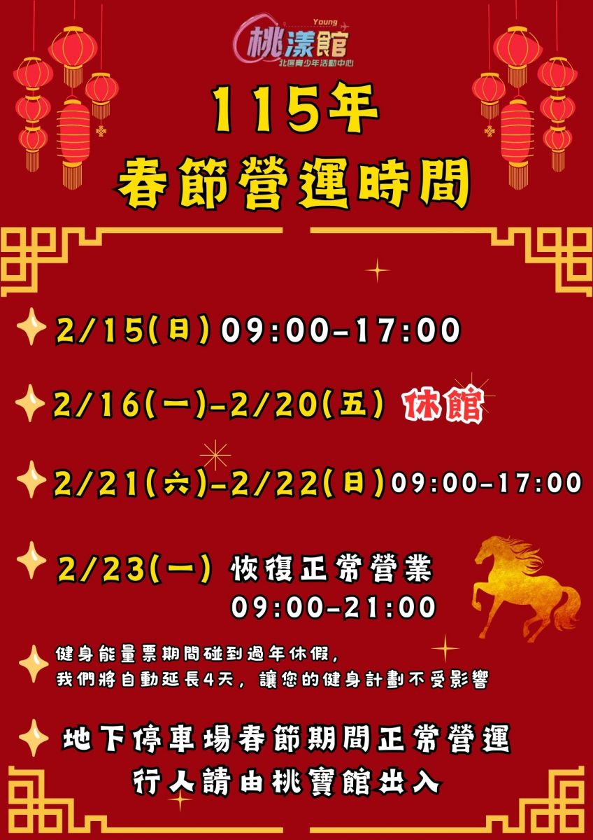 【春節營運時間公告】 以下是桃漾館的營運時間: ღ2/15(日)09:00-17:00 ღ2/16(一)-2/20(五)休館 ღ2/21(六)-2/22(日)09:00-17:00 ღ2/23(一)恢復正常營業 09:00-21:00 地下停車場春節期間正常營運 地點:桃漾館(八德區建德路350號 ) 洽詢電話:03-3656969 #121 #桃漾館 #春節營運時間 #春節 #休館通知 #桃漾館公告 #營業時間 #春節活動 #歡迎來訪