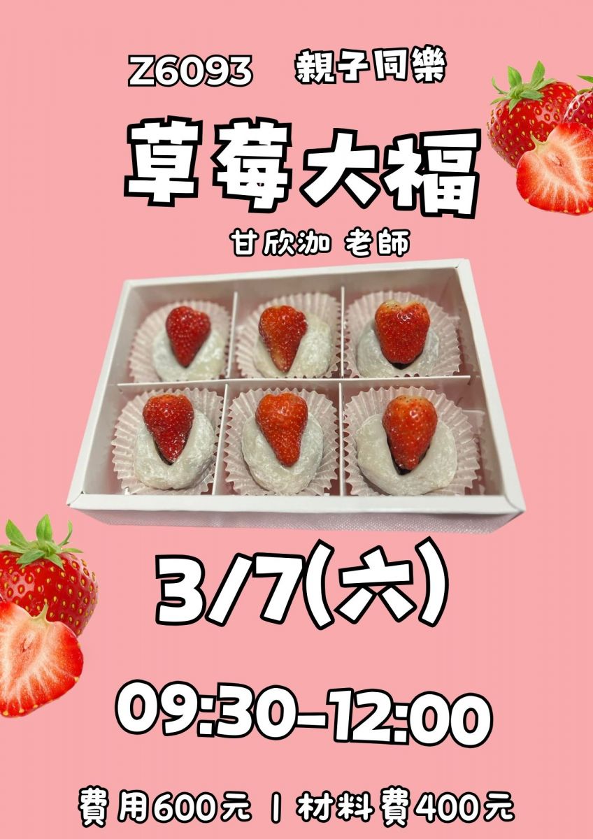 親子同樂 - 草莓大福 來一起動手做草莓大福,和孩子一起享受親子同樂的時光吧! ● 課程代號 : Z6093 ● 時間: 3月7日(六)09:30-12:00 ● 學費: 600元 / 材料費: 400元 ● 地點: 桃漾館 (八德區建德路350號) ● 報名網址:https://scr.cyc.org.tw/tp22.aspx ● 課程簡章:https://reurl.cc/dqYRM6 ● 洽詢電話: 03-3656969 #121 快帶著寶貝一起來做草莓大福,學習製作美味又可愛的點心,增進親子感情!名額有限,快來報名吧! #親子同樂 #草莓大福 #親子活動 #手作甜點 #親子互動 #親子時光 #桃漾館 #八德活動 #草莓大福DIY #親子工坊 #家庭樂